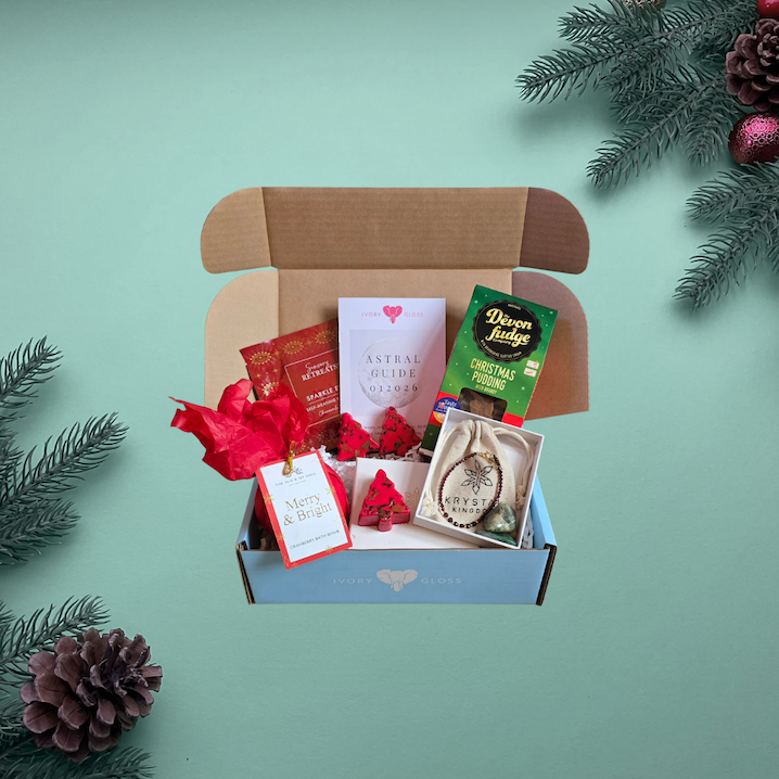 Each month's box includes two guided meditations and rituals with crystals for the new and full moon, plus luxury self-care treats, candles, essential oils, smudge, snacks and other indulgent delights.